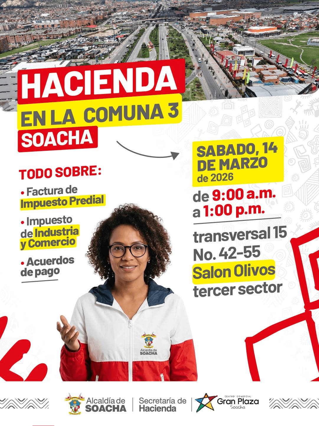 Estaremos en el Salón Olivos lll sector, Comuna 3, para que reclames tu factura del Impuesto Predial y conozcas los alivios tributarios disponibles para ti.