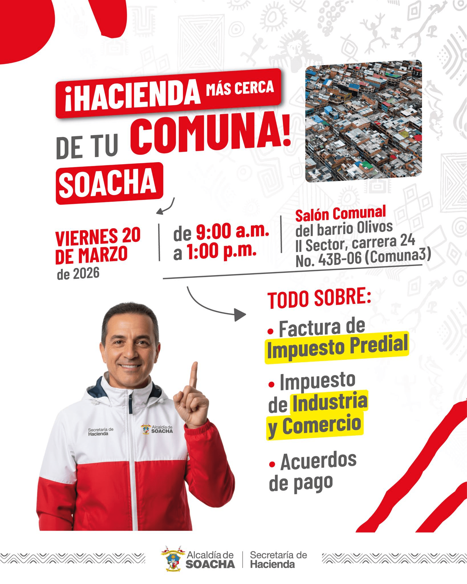 Estaremos en el Salón Comunal del barrio Olivos ll sector, Comuna 3, para que reclames tu factura del Impuesto Predial y conozcas los alivios tributarios disponibles para ti.