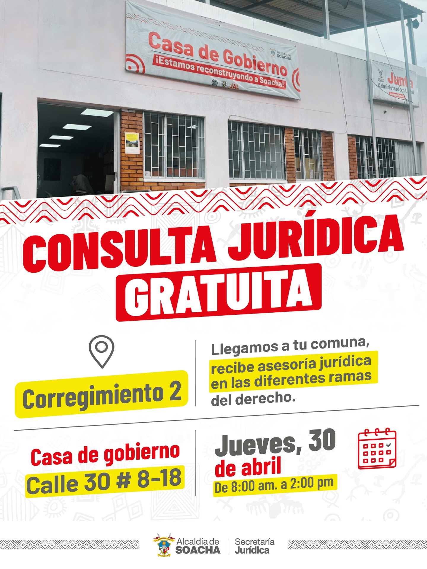 No te pierdas esta oportunidad de recibir asesoría jurídica GRATUITA. El Gobierno de la Ciudad, te invita este jueves 30 de abril a la Casa de Gobierno en Corregimiento 2 (Calle 30 # 8-18) de 8:00 a.m. a 2:00 p.m.