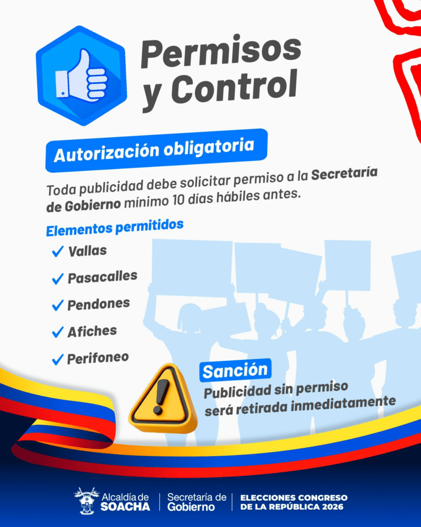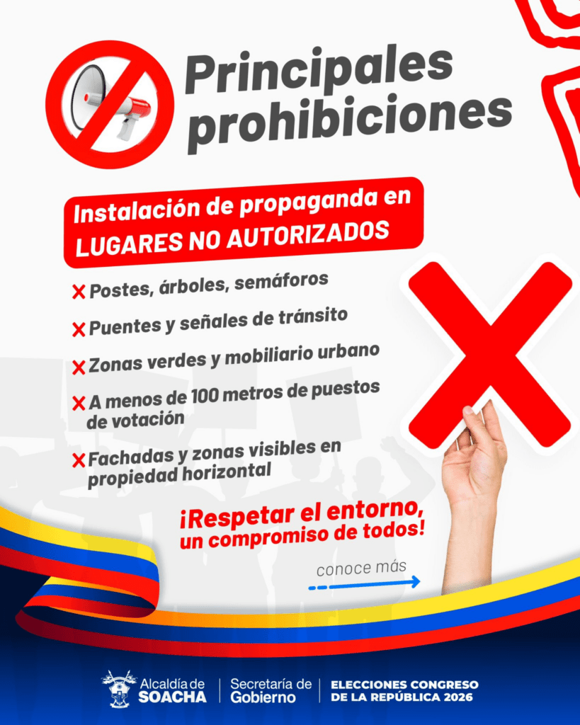 En Soacha promovemos una contienda electoral ordenada, transparente y respetuosa del espacio público. Por eso, la publicidad política debe cumplir unas reglas claras que buscan proteger el entorno y garantizar la convivencia ciudadana.