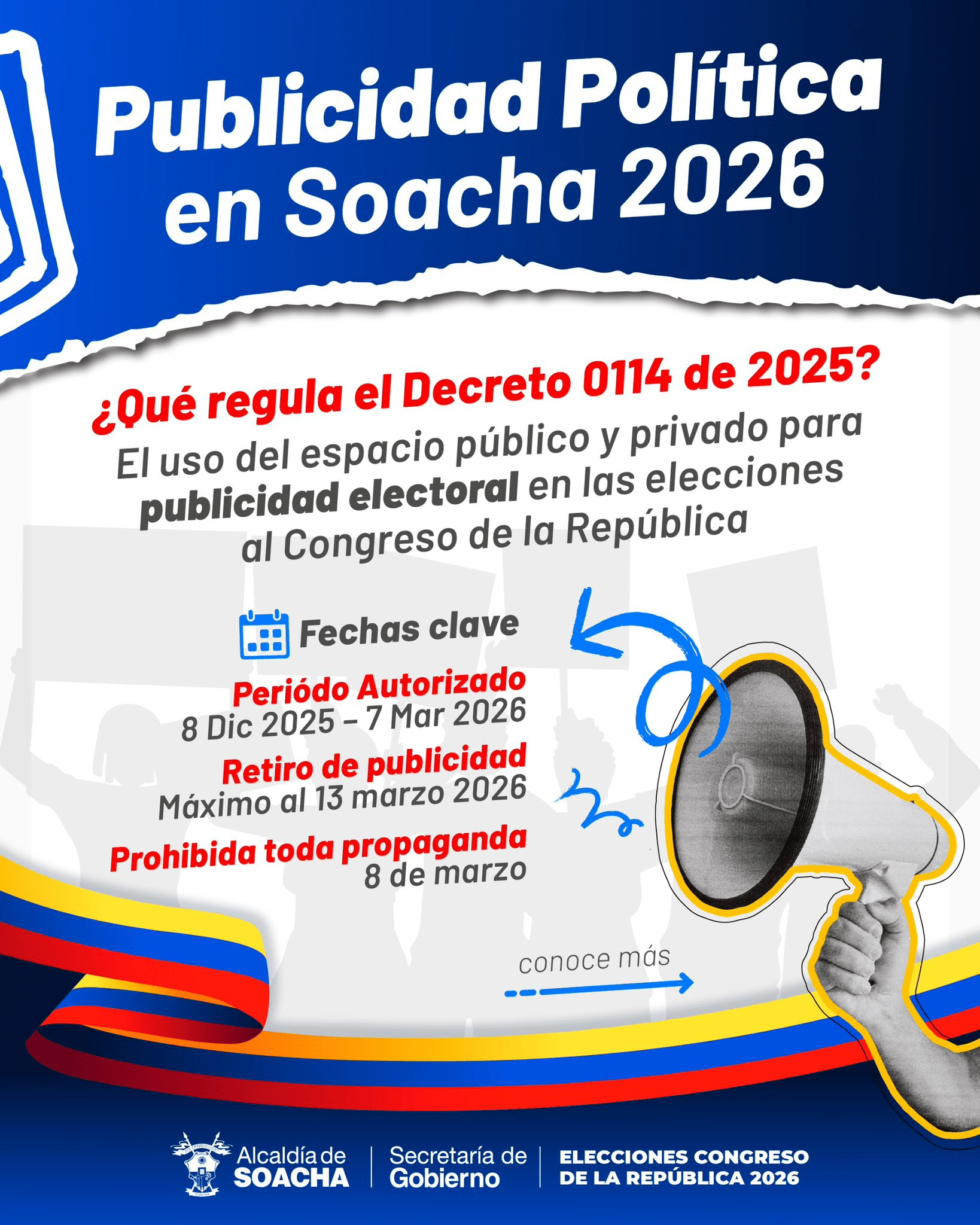 En Soacha promovemos una contienda electoral ordenada, transparente y respetuosa del espacio público. Por eso, la publicidad política debe cumplir unas reglas claras que buscan proteger el entorno y garantizar la convivencia ciudadana.