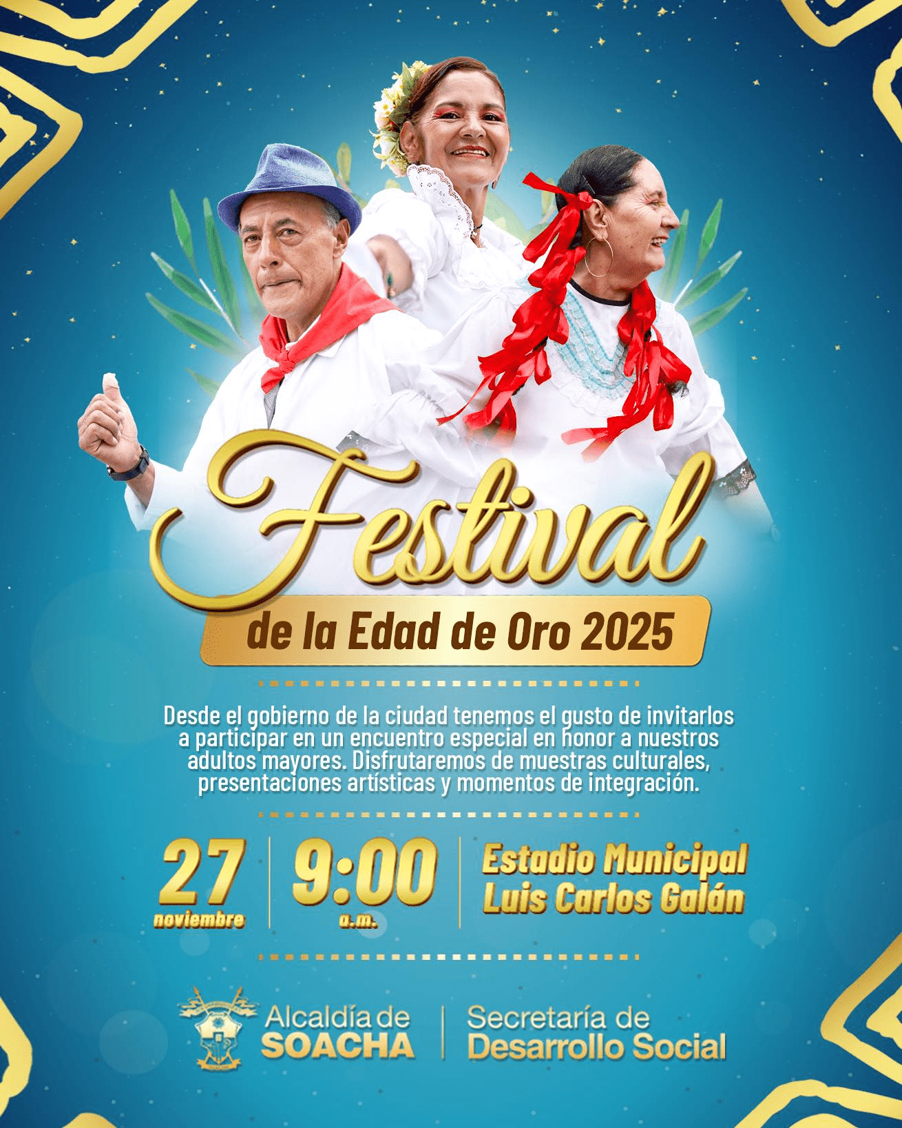 Te invitamos al Festival de la Edad de Oro 2025, un encuentro lleno de cultura, arte y tradición. Acompáñanos a vivir una mañana especial con presentaciones, muestras culturales y actividades pensadas para honrar a quienes han construido la historia de nuestra ciudad.