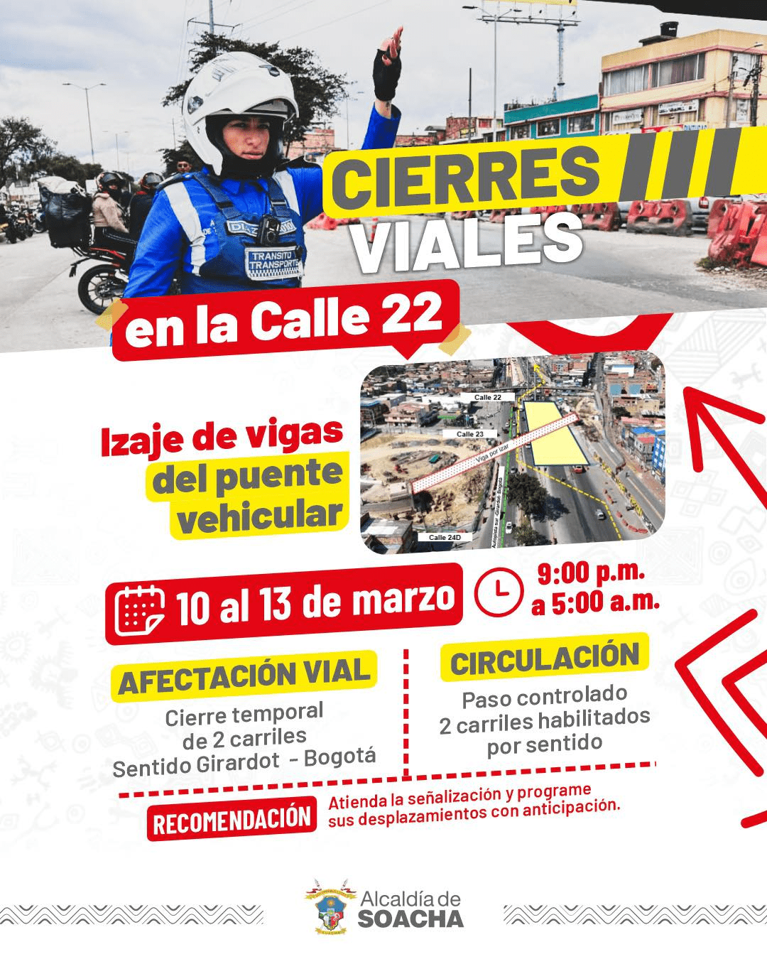 Cierres viales nocturnos por obras en la Calle 22 – Secretaría de Movilidad de Soacha