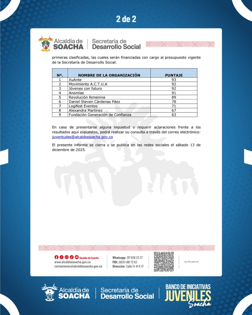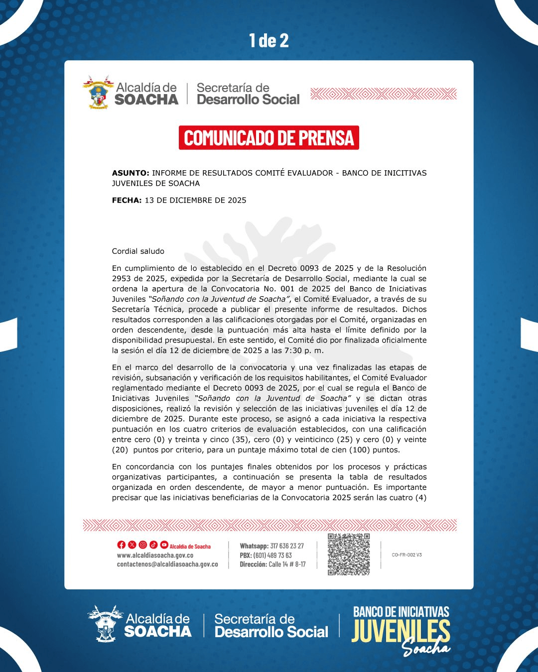 La Alcaldía de Soacha, a través de la Secretaría de Desarrollo Social, publica los resultados del Comité Evaluador del Banco de Iniciativas Juveniles “Soñando con la Juventud de Soacha”.