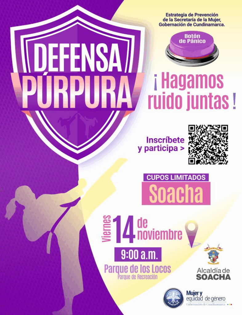 Llega a Soacha la estrategia Defensa Púrpura, una jornada pensada para que las mujeres aprendan herramientas de autocuidado y defensa personal, mientras levantamos la voz contra la violencia de género.