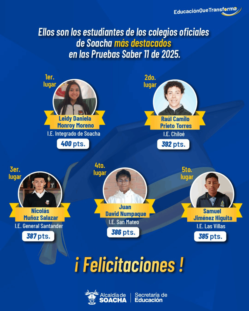 Ellos son los estudiantes de los colegios oficiales de Soacha más destacados de las Pruebas Saber 11 de 2025 – Secretaría de Educación de Soacha