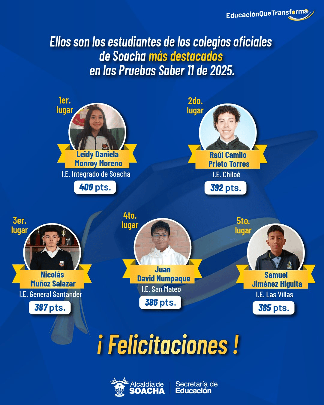 Ellos son los estudiantes de los colegios oficiales de Soacha más destacados de las Pruebas Saber 11 de 2025 – Secretaría de Educación de Soacha