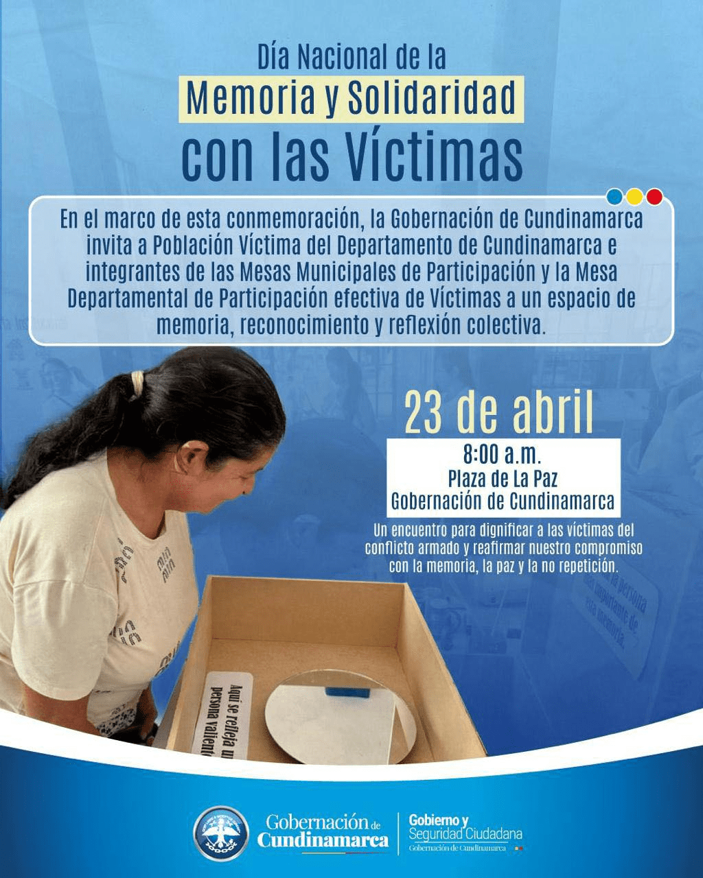 Este jueves 23 de abril conmemoramos el Día Nacional de la Memoria y Solidaridad con las Víctimas en Cundinamarca, un encuentro para dignificar sus historias, reconocer sus voces y seguir construyendo memoria, paz y no repetición en el territorio.