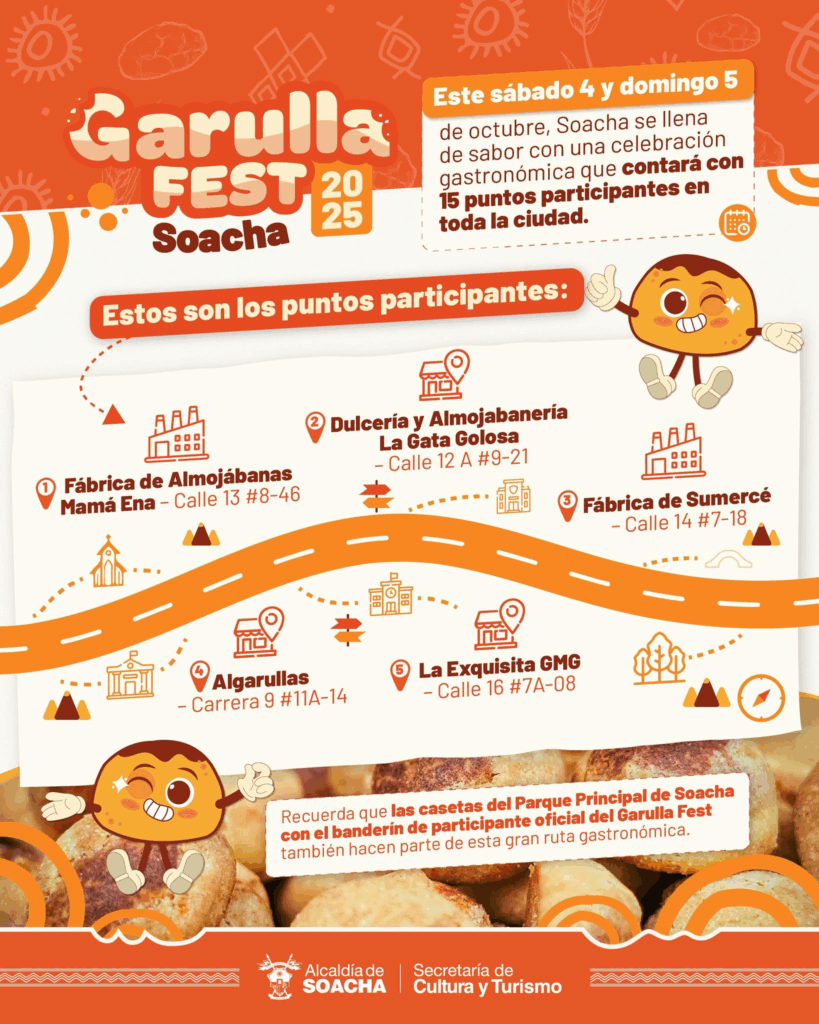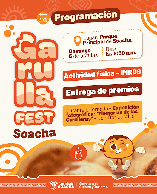 La Secretaría de Cultura y Turismo de Soacha, invitan a toda la ciudadanía a participar en el Garulla Fest 2025, un evento que exalta la identidad gastronómica del municipio; se realizará el próximo sábado 4 y domingo 5 de octubre de 2025.