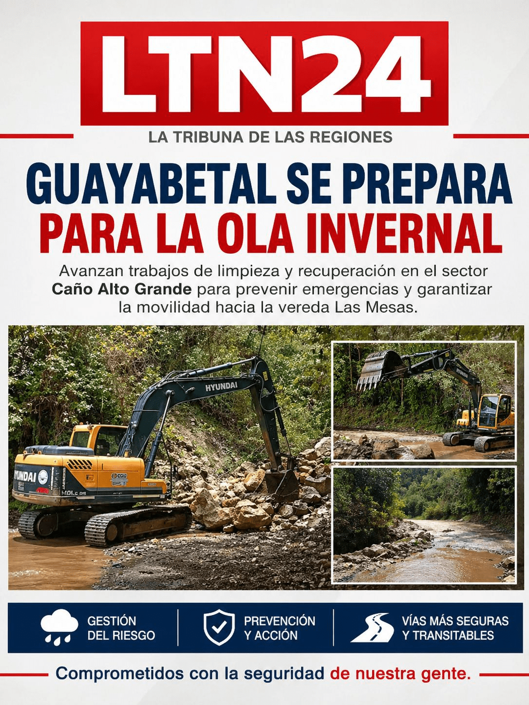 El municipio de Guayabetal avanza en acciones preventivas frente a la inminente temporada invernal, con trabajos de limpieza y recuperación en puntos críticos de su red vial y fuentes hídricas. En las últimas horas, se ejecutó la intervención de la batea ubicada en el sector Caño Alto Grande, corredor clave que comunica con la vereda Las Mesas.