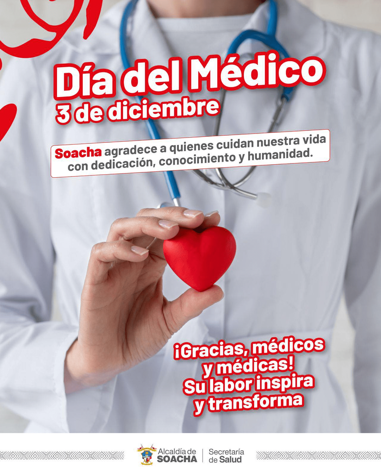 Hoy, en el Día del Médico, la Alcaldía de Soacha y la Secretaría de Salud rinden un especial reconocimiento a todas y todos los profesionales que, con compromiso, ética y vocación de servicio, trabajan cada día por proteger la vida y el bienestar de nuestra comunidad.