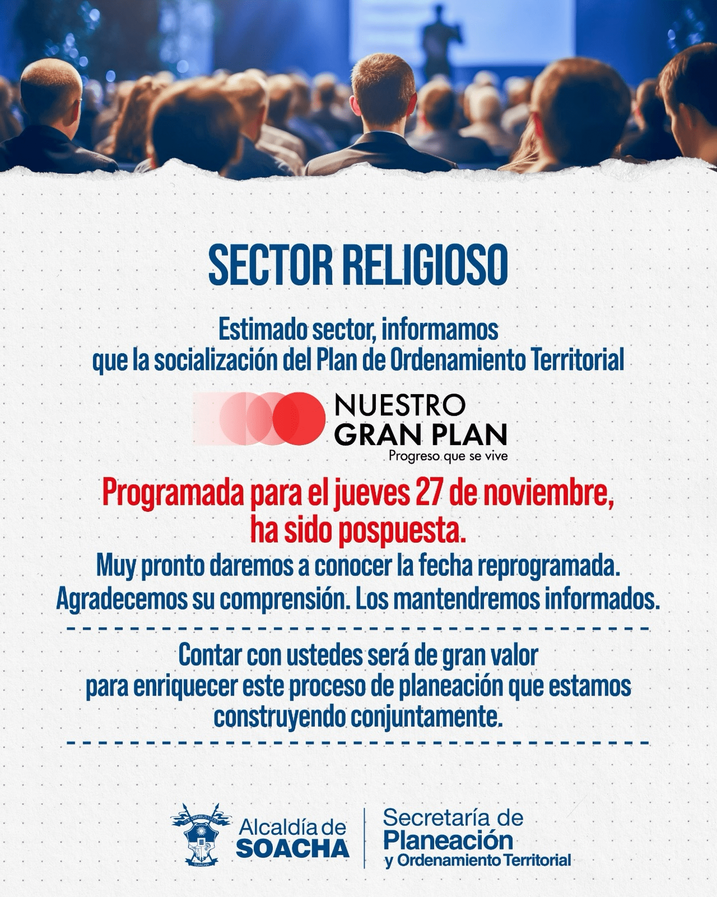 🚨 Informamos al Sector Religioso que la jornada de socialización del POT ha sido pospuesta.