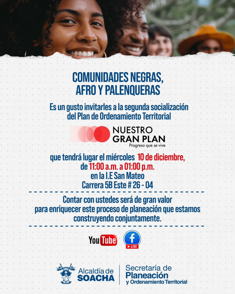 Las comunidades Negras, Afro y Palenqueras están invitadas a participar en la jornada de socialización de “Nuestro Gran Plan”, el proyecto del Plan de Ordenamiento Territorial de Soacha.