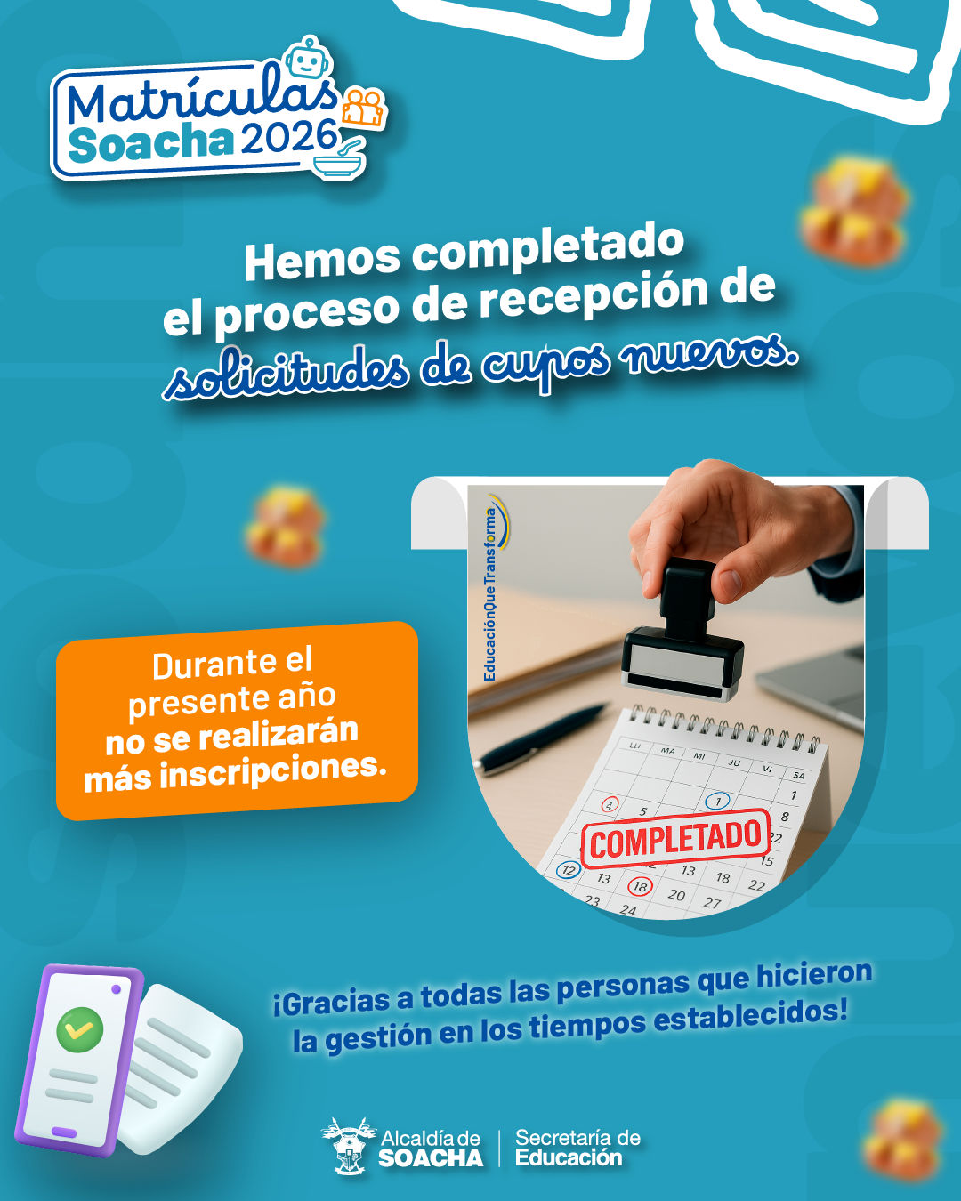 . SI no hiciste la solicitud de cupo oportunamente, debes estar atento a los canales oficiales de la Secretaría de Educación y la Alcaldía de Soacha.