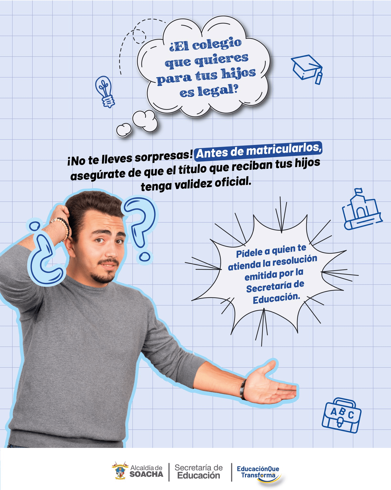 ¡No permitas que el esfuerzo de tus hijos se pierda en instituciones sin respaldo! 🛡️ Antes de matricularlos en un colegio privado verifica que cuente con validez oficial solicitando la resolución vigente emitida por la Secretaría de Educación de Soacha.