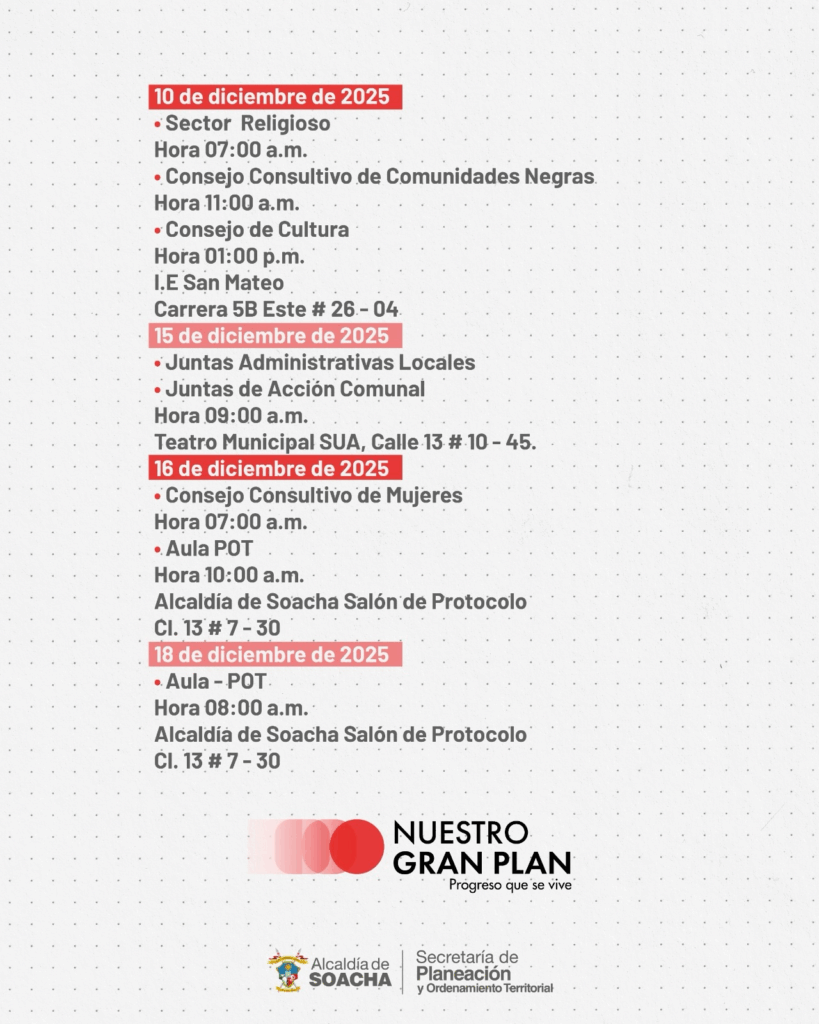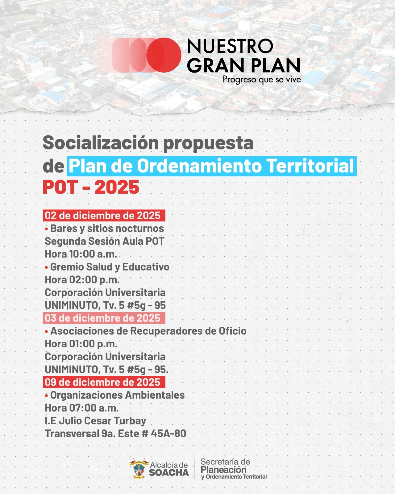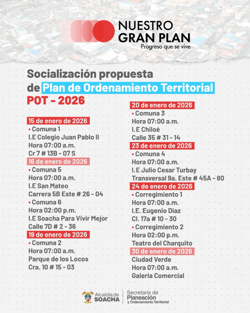 Desde la Administración de la ciudad, seguimos construyendo una ciudad con visión de futuro. Por eso, estamos socializando nuevas fechas para continuar nuestras concertaciones del Plan de Ordenamiento Territorial (POT), un proceso participativo que nos permitirá planear la Soacha que soñamos, sostenible, ordenada y pensada para el bienestar de todos.