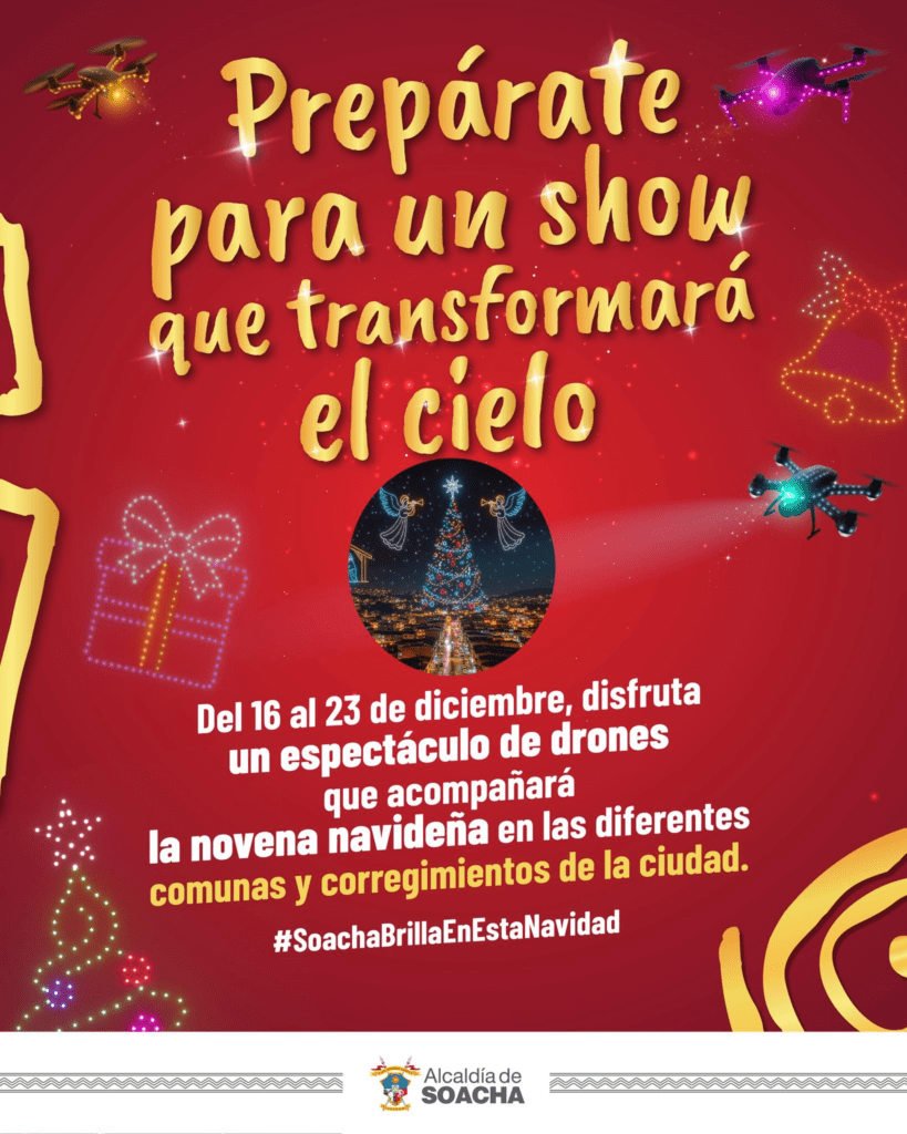 Del 16 al 23 de diciembre, a partir de las 6:00 p. m., Soacha se llenará de magia con un espectáculo de drones que acompañará la novena navideña en nuestras comunas y corregimientos.