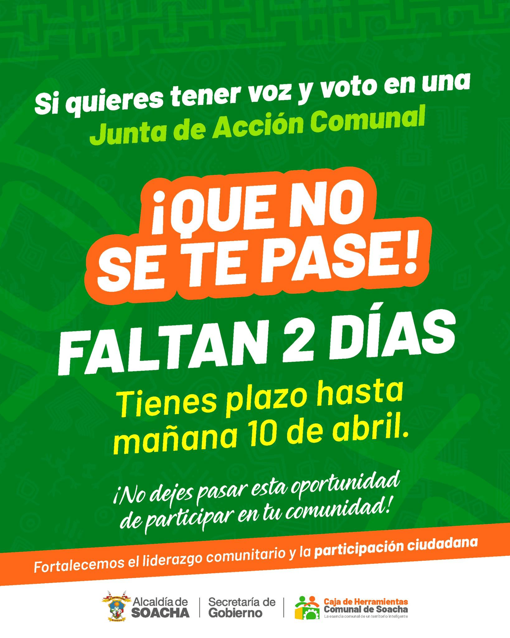 Faltan 2 días para inscribirte y hacer parte de tu Junta de Acción Comunal. Es tu oportunidad de tener voz y voto, y participar activamente en las decisiones que transforman tu barrio.