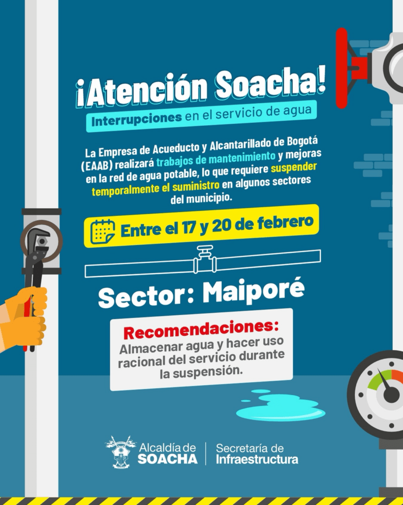 En Soacha se programaron cortes de agua entre el 17 y el 20 de febrero en sectores como Maiporé, debido a trabajos de mantenimiento y ajustes en la red.