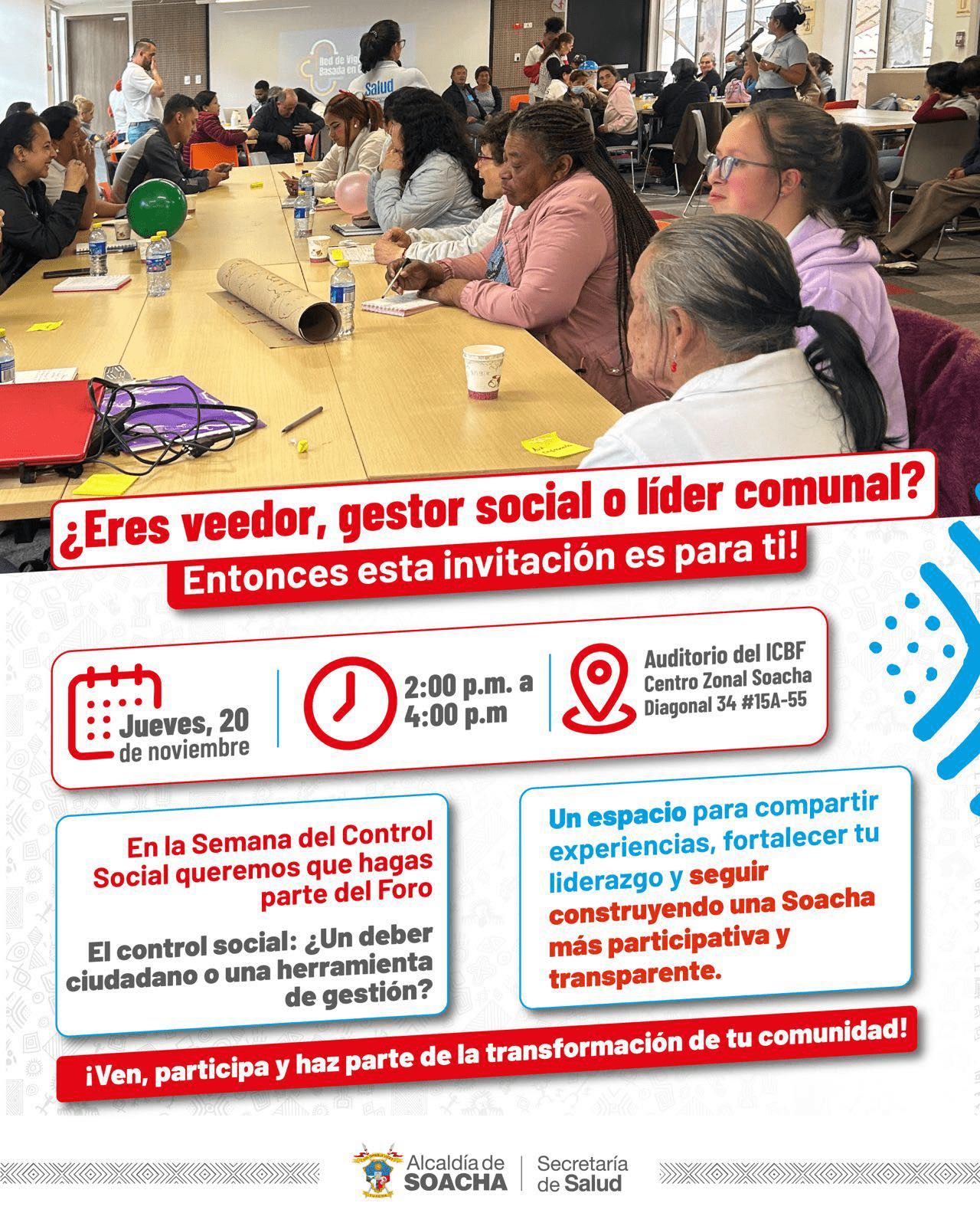 Hoy se realiza el Foro de la Semana del Control Social, un espacio creado para líderes, veedores y gestores que quieren fortalecer su voz y aportar a una Soacha más participativa.
