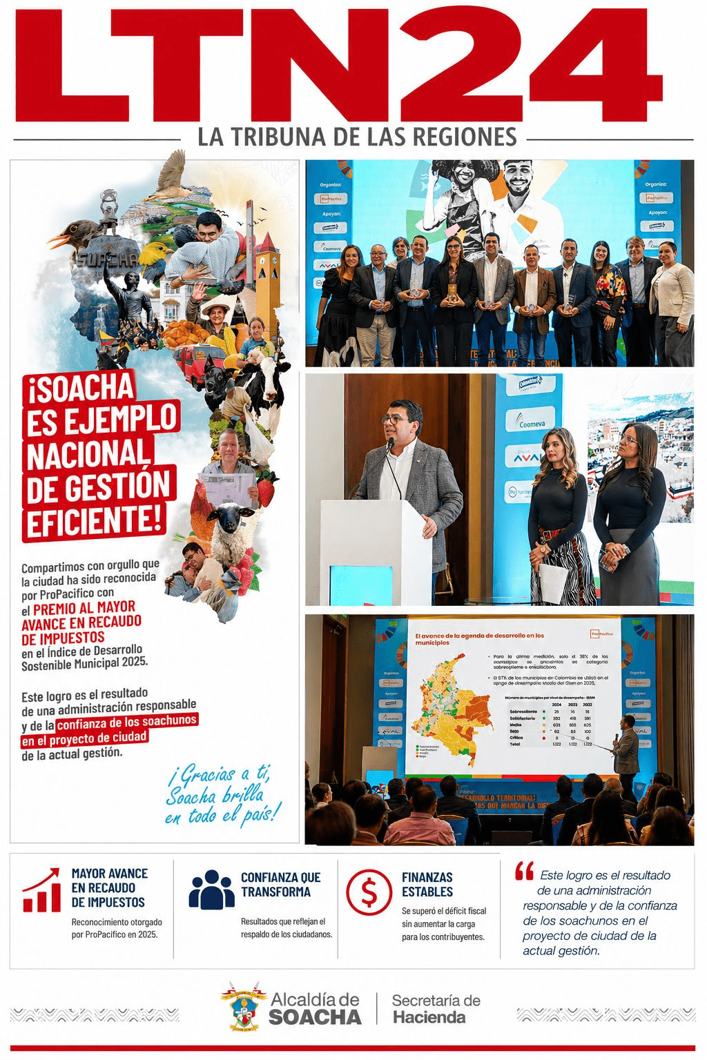 Los resultados evidencian una recuperación sostenida de las finanzas públicas, superando el déficit fiscal heredado y garantizando estabilidad económica mediante estrategias responsables y transparentes. La articulación entre la administración municipal y la ciudadanía ha sido clave para este logro, posicionando a Soacha como referente nacional en desarrollo territorial, eficiencia fiscal y gobernanza moderna.
