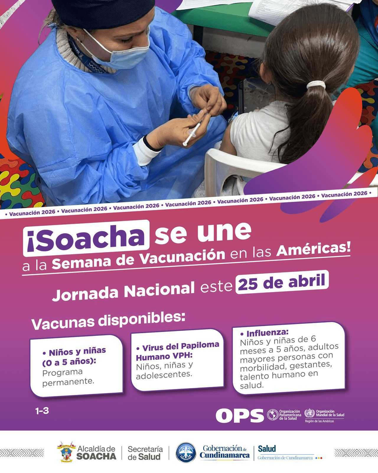 Soacha se une a la Semana de las Américas con una jornada especial de vacunación este sábado 25 de abril, en articulación con el Ministerio de Salud y Protección Social.