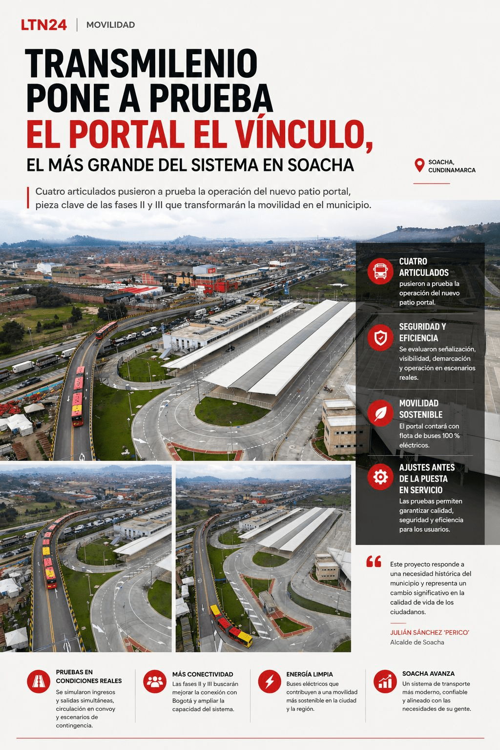 TransMilenio inició las primeras pruebas operativas en el Portal El Vínculo, una infraestructura clave para la expansión del sistema en el municipio. Cuatro buses articulados recorrieron el nuevo patio portal, evaluando condiciones reales de funcionamiento como maniobras, tiempos de respuesta y escenarios de contingencia.