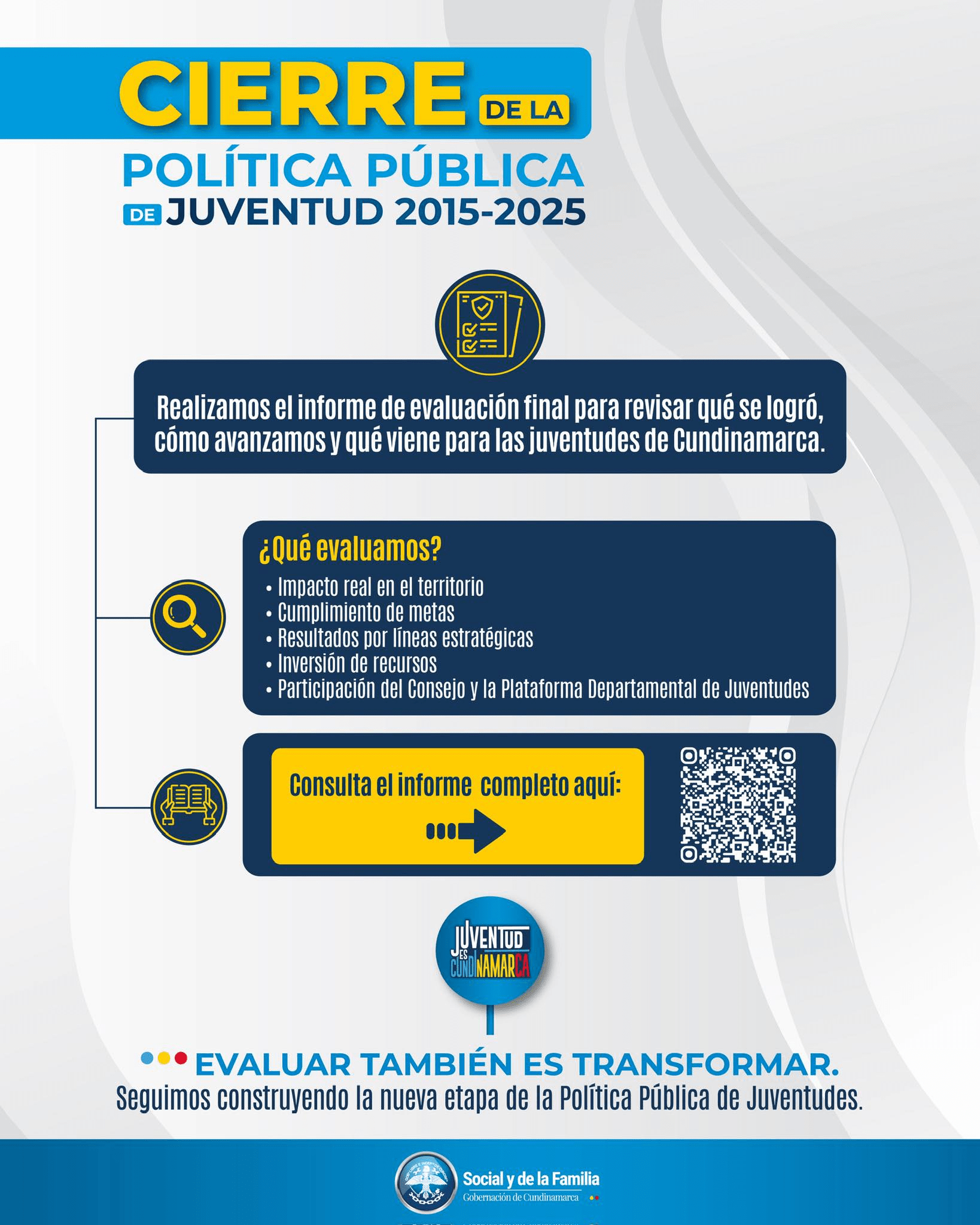 🚨📊 Ya está disponible el Informe de Evaluación de la Política Pública de Juventud 2015–2025, un documento clave donde podrás conocer: